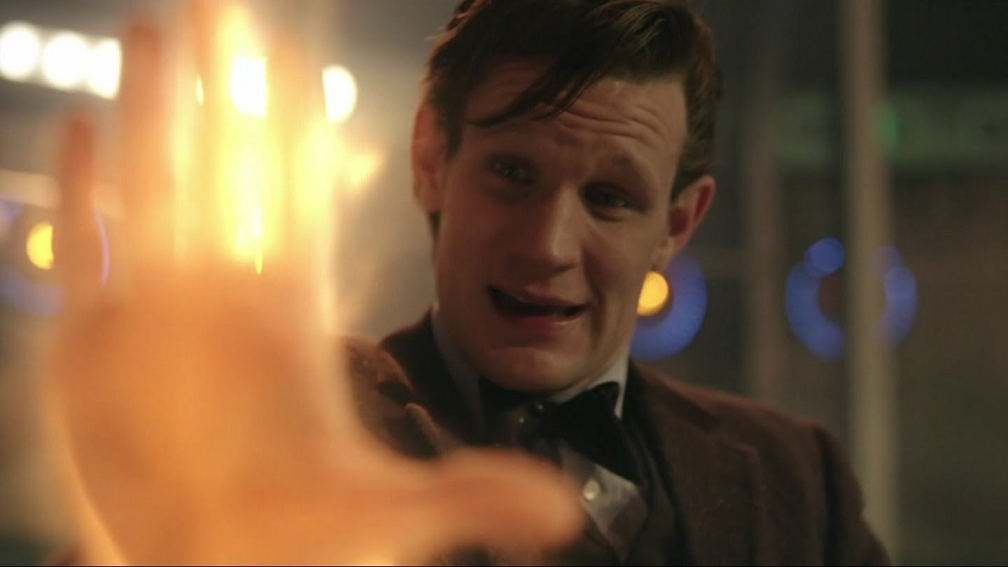 You know how the regeneration energy has really gotten crazy out of hand? With Eccleston, it was a huge fireworks display. With Tennant (the first time), he destroyed the inside of his own TARDIS. Smith took out an entire orbiting Dalek fleet! So it’s on record that regenerative energy is wildly unpredictable and the energy levels can fluctuate exponentially. Okay.