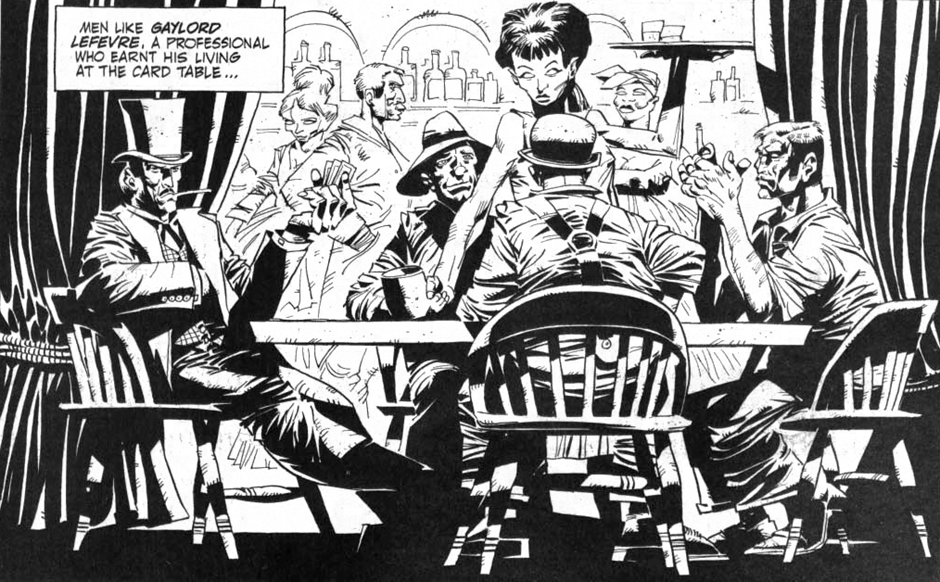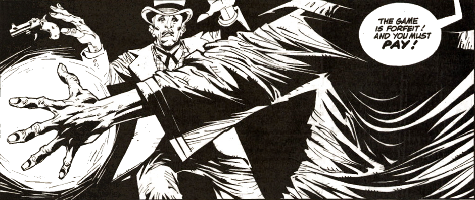 For those not familiar with The Greatest Gamble: a gambler, named Lefevre, is on a Mississippi paddle steamer playing Poker, sometime during the late 1800s. He spots an opponent palming an ace and shoots the opponent dead. At this point, the Celestial Toymaker appears and invites Lefevre to play against him. Agreeing, Lefevre is instantly transported to the Toymaker’s domain. As he enters, he passes life-size statues of people. One I particularly remember noticing, on the story’s last page, was of an American second world war soldier which would have been about half a century in Lefevre’s future.
