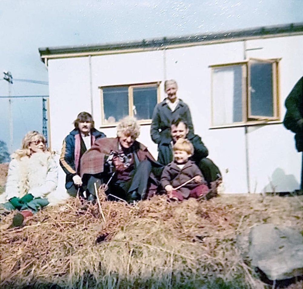 The pictures were published by Julian Roberts on Facebook and feature his father and elder brother. They haven’t been published before and show Jon Pertwee, Katy Manning, and Nicholas Courtney filming scenes on location at Ogilvie Pit in Deri, Wales. Katy Manning is wearing glasses in some of the photos, which she always removed for filming and confessed to being “as blind as a bat” without them.