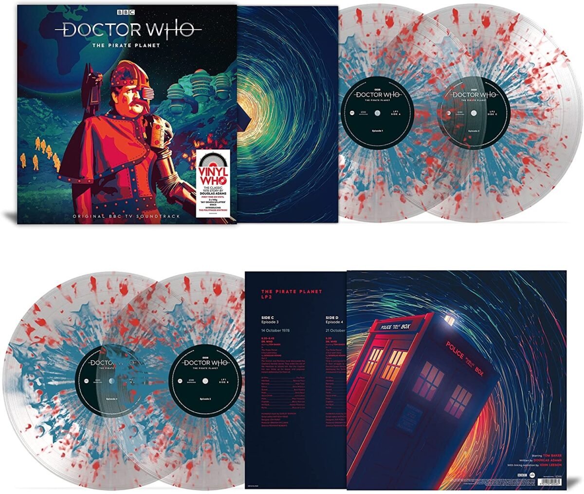 The Pirate Planet is presented across two 140g “Sky Demon Splatter” vinyl discs, in a fully illustrated gatefold sleeve showing cast and credits, and inner bags featuring complete episode billings.