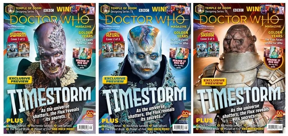 The latest issue of Doctor Who Magazine is out now, and comes with three potential covers, featuring enemies from Doctor Who Series 13, better known as Flux: Swarm, Azure, and the Sontaran, Skaak.